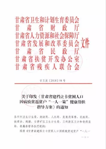 为了向全市建档立卡贫困人口因病致贫返贫户有针对性地制定帮扶计划,提供个性化的、全方位的、免费的家庭医生签约服务中级包,市县公立医院副高级以上专家与乡镇卫生院大夫、乡村医生和计生专干组成帮扶工作队,通过分片包干,落实“一人一策”帮扶措施,着力解决有病看不了、看病就医难、健康管不好等问题,做细做实健康扶贫工作。按照省卫计委等7部门联合印发的《甘肃省建档立卡贫困人口因病致贫返贫户“一人一策”健康帮扶指导方案》精神,庆阳市制定了《实施方案》,层级召开了工作会议,全面开展了建档立卡贫困人口因病致贫返贫户“一人一策”健康帮扶工作。从3月30日开始,在全市开展了一场声势浩大的健康扶贫行动。